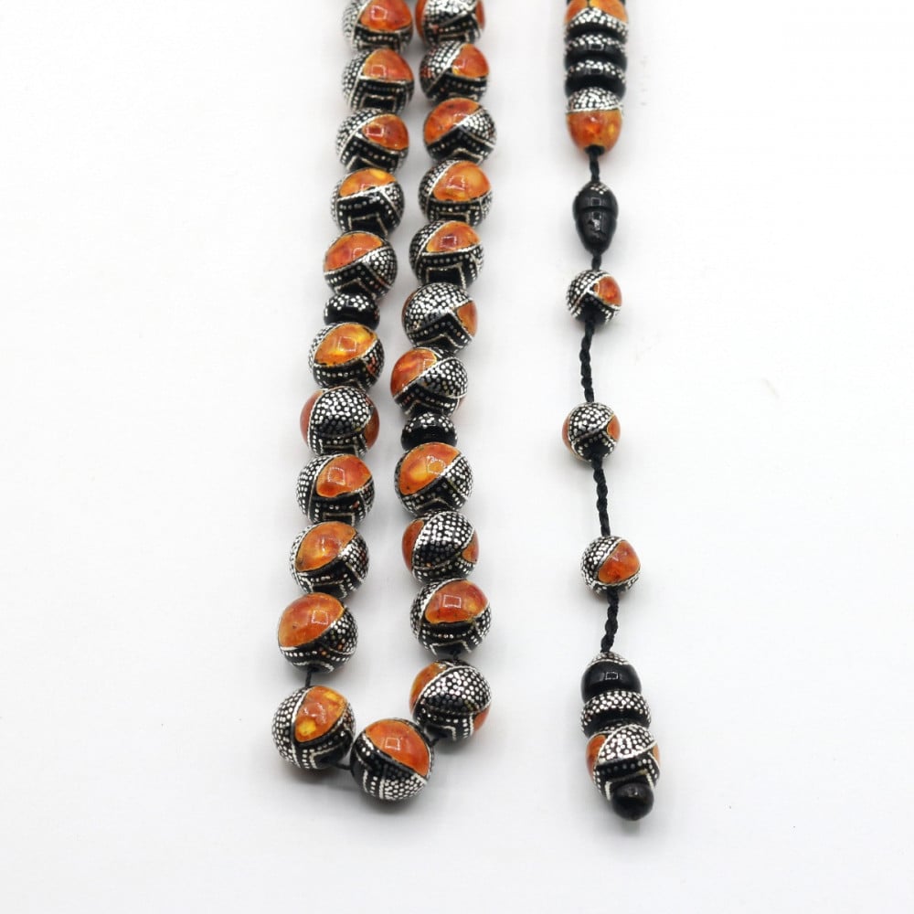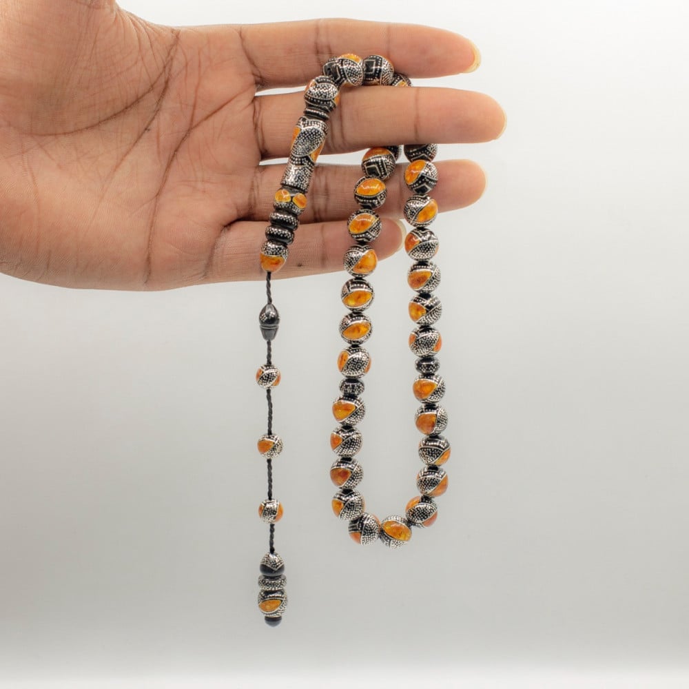 سبحه من ثمره الكوك مطعمه بالفضه والكهرمان ومنقوشه يدوياً